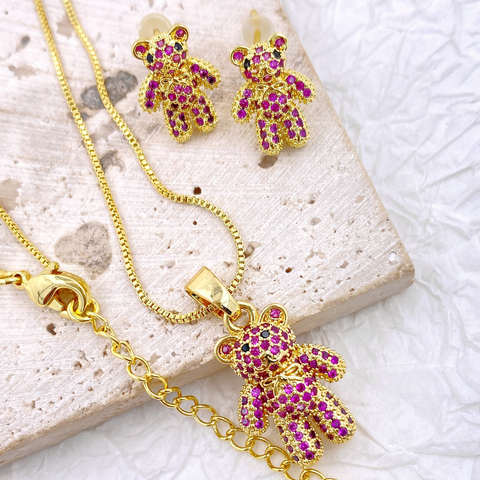 Bonito conjunto de joyería de oso con inserción de circón rosa, collar, pendiente, joyería de latón chapada en Color Dorado a la moda para mujer y Niña