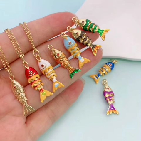 Verano colorido esmalte pescado colgante chapado en oro encanto en forma de pez colgante latón cobre encanto venta al por mayor collar