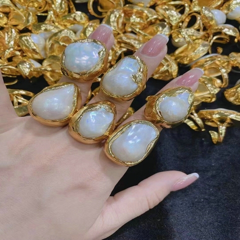 Grande pietra preziosa naturale di cristallo Vug di acqua dolce perla con zircone oro placcato anello in ottone regolabile moda moda moda in stile in gioielli